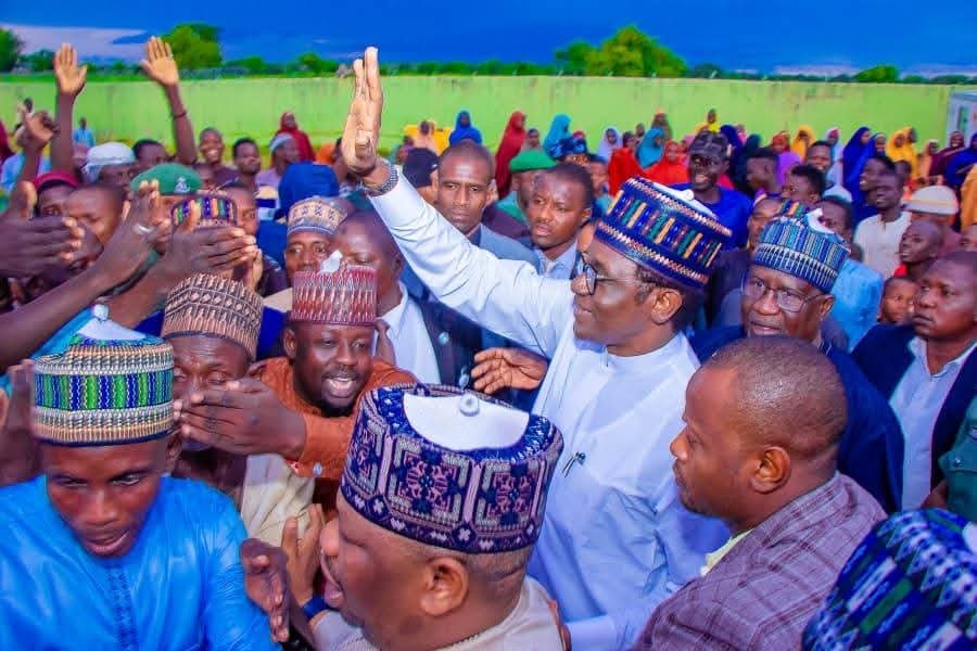 A massive crowd greets His Excellency, the Executive Governor of Yobe State, Hon. (Dr.) Mai Mala Buni CON, COMN with jubilation while on a surprise assessment tour of Wagir and Mutai Primary Healthcare centres in Gujba local government area on Thursday, 25 September 2025.