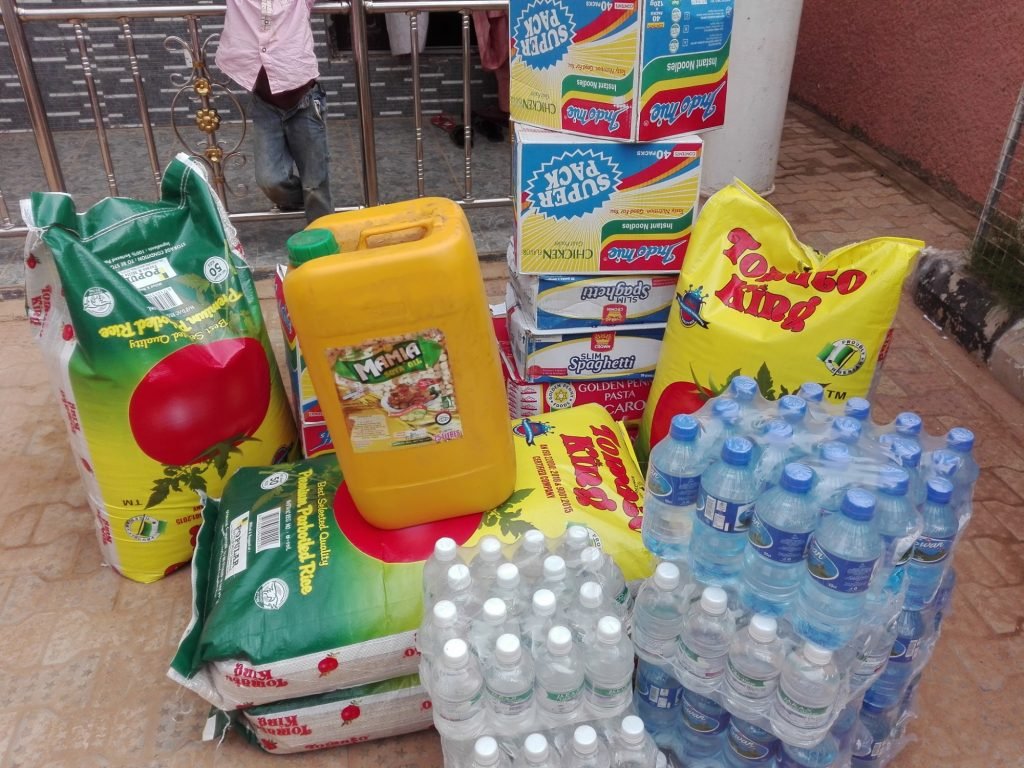 The food items donated included 4 cartons of indomie, 4 bags of rice (50kg), 2 cartons of Spaghetti, 2 cartons of Marconi, cooking oil (50kg) and 16 packs of swan water.
